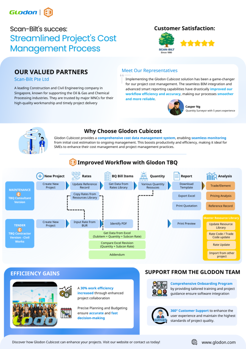 Scan - Bilt Pte Ltd , a leading construction and civil engineering company in Singapore, has been making remarkable strides in project cost management. Known for their high-quality workmanship and timely project delivery, Scan-Bilt is trusted by major multinational corporations (MNCs) in the oil & gas and chemical processing industries. Their collaboration with Glodon Cubicost has revolutionized their workflow, bringing enhanced efficiency and accuracy to their cost management practices.